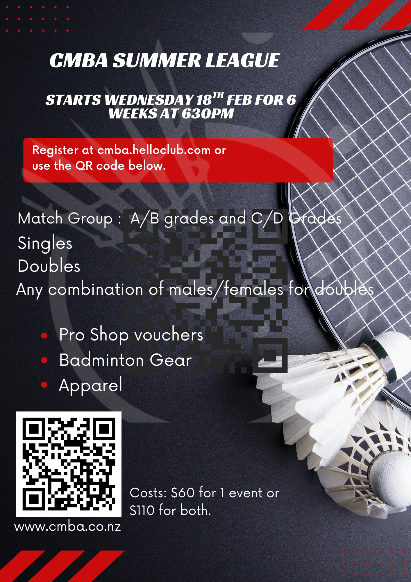 Venue: Counties Manukau Badminton Association, 41r Elliot Street, Papakura |